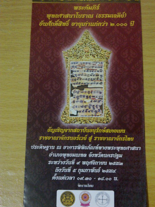 Mr. Nopparat Benjawattananun, the Director of Office of National Buddhism, unveiled that the invitation of Dhamma Cetiyas to Thailand in this time is important for Buddhists because these scriptures are widely accepted by the international archeologists and linguists that they are the oldest Buddhist Scriptures in the world. They were found in a cave around the Bamiyan Mountain in Afghanistan before the war. They were located 2 kilometers away from the Buddha Bamiyan which is destroyed by the Taliban government in 2001. The archeologists and linguists had spent 12 years to rearrange these scriptures and presume that they are the Dhammavinaya engraved by the arahants in the 6th century. Now they are collected by Schoyen Collection, University of Oslo in Norway.