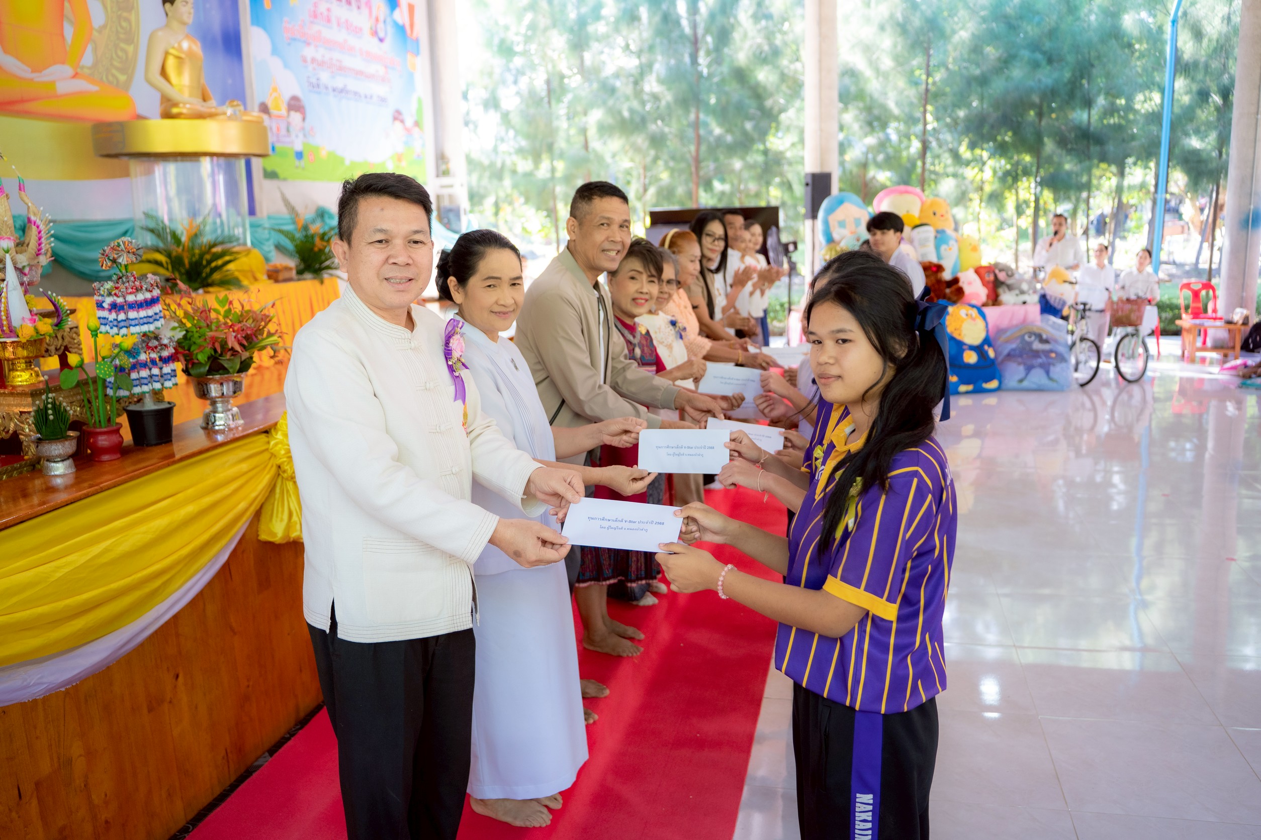 จากนั้นเป็นพิธีมอบเกียรติบัตรแก่สถานศึกษาที่เข้าร่วมงาน โดยนายสัญญา กุลสุวรรณ์ ประธานในพิธี ก่อนที่ประธานสงฆ์ และผู้ใหญ่ใจดีได้มอบทุนการศึกษาแก่เด็กดี V-Star และให้โอวาทอันทรงคุณค่า เพื่อเป็นกำลังใจให้เด็ก ๆ นำศีลธรรมไปใช้ในชีวิตประจำวัน และถ่ายภาพประวัติศาสตร์ร่วมกัน