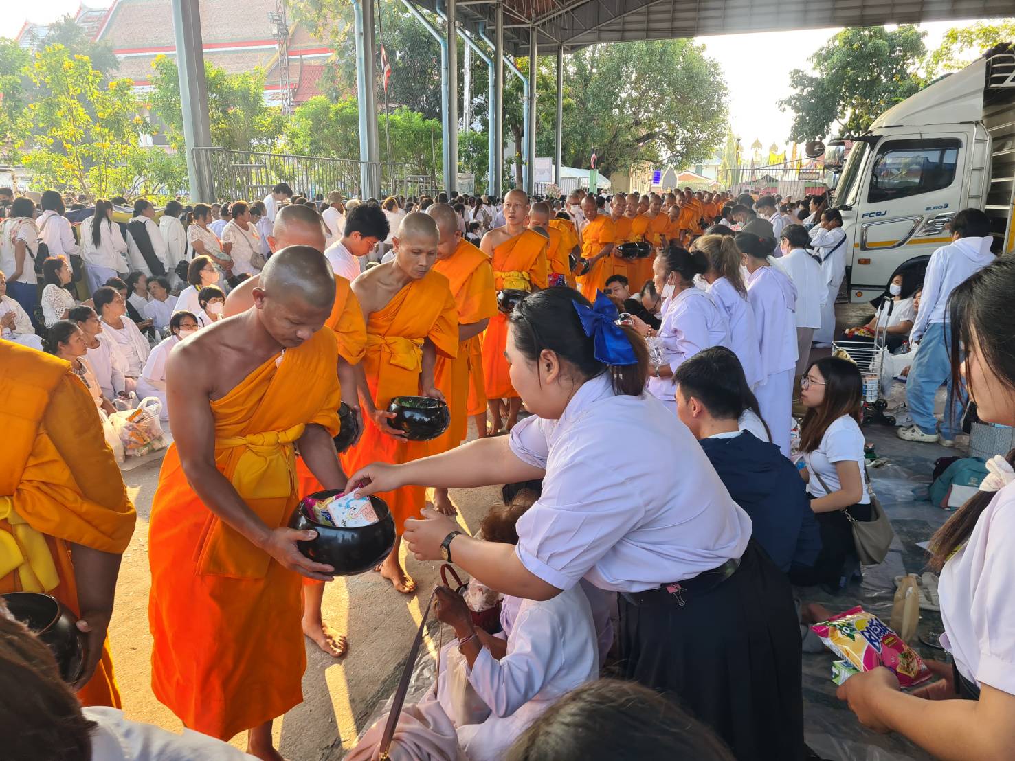 จากนั้นในเช้าวันที่ 18 มกราคม ได้ร่วมพิธีตักบาตรพระธรรมยาตรา 1,142 รูป ณ วัดโบสถ์บน บางคูเวียง โดยช่วยกันรับบุญ รับอาหารตักบาตรจากพระธรรมยาตรา และคัดแยกอาหารตักบาตรเพื่อเตรียมแจกจ่ายให้กับชุมชน และนำไปส่งต่อให้กับวัดในจังหวัดนนทบุรี รวมทั้งช่วยกันขนอาหารตักบาตรขึ้นรถสิบล้อ ร่วมกับสาธุชนที่มาร่วมงานอีกด้วย
