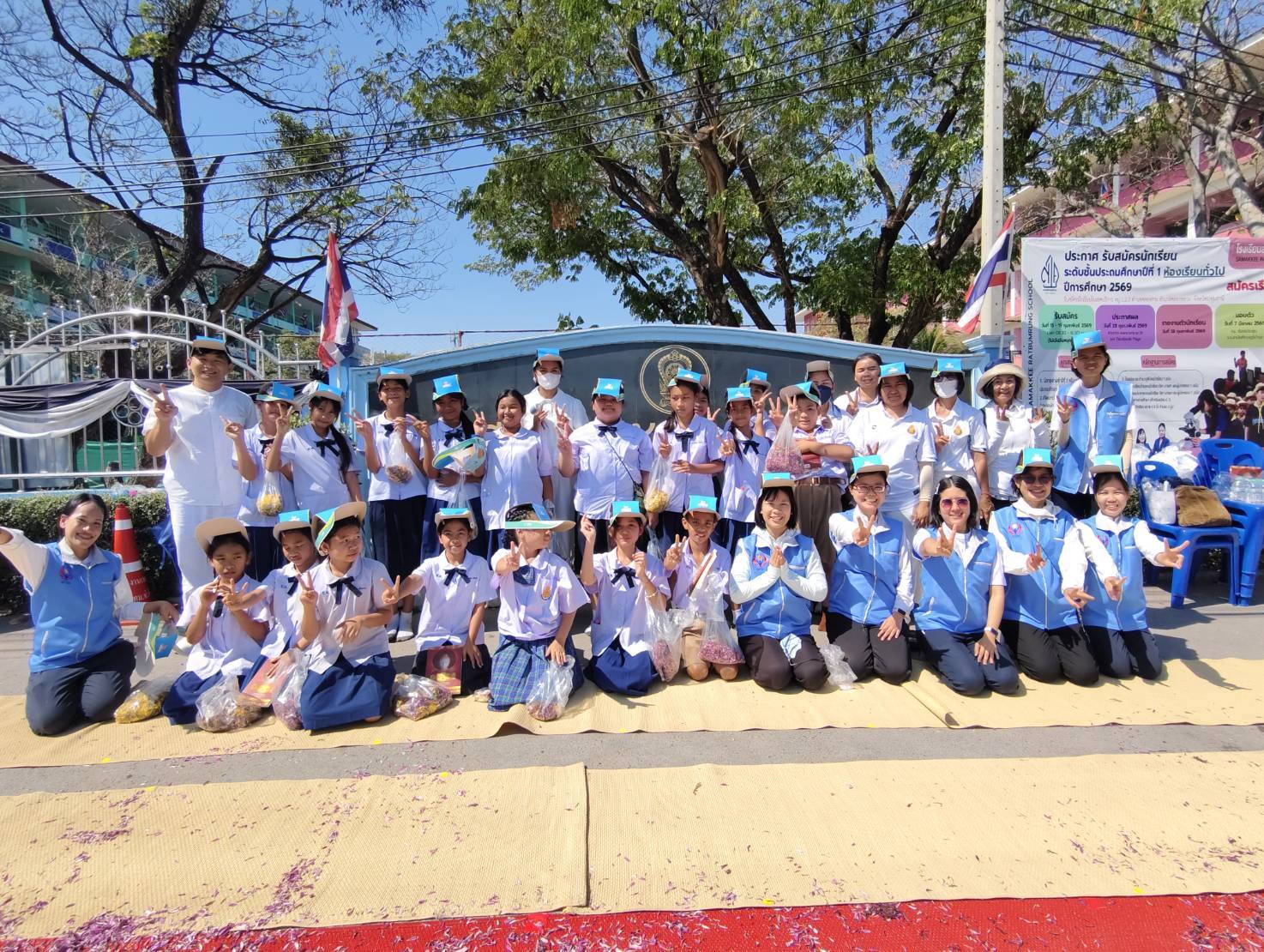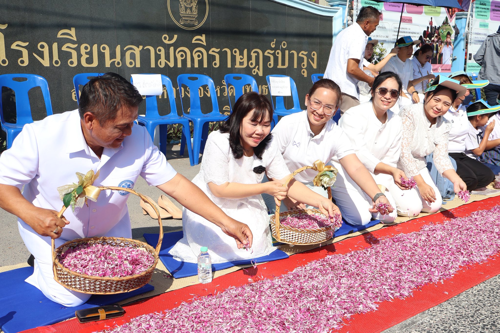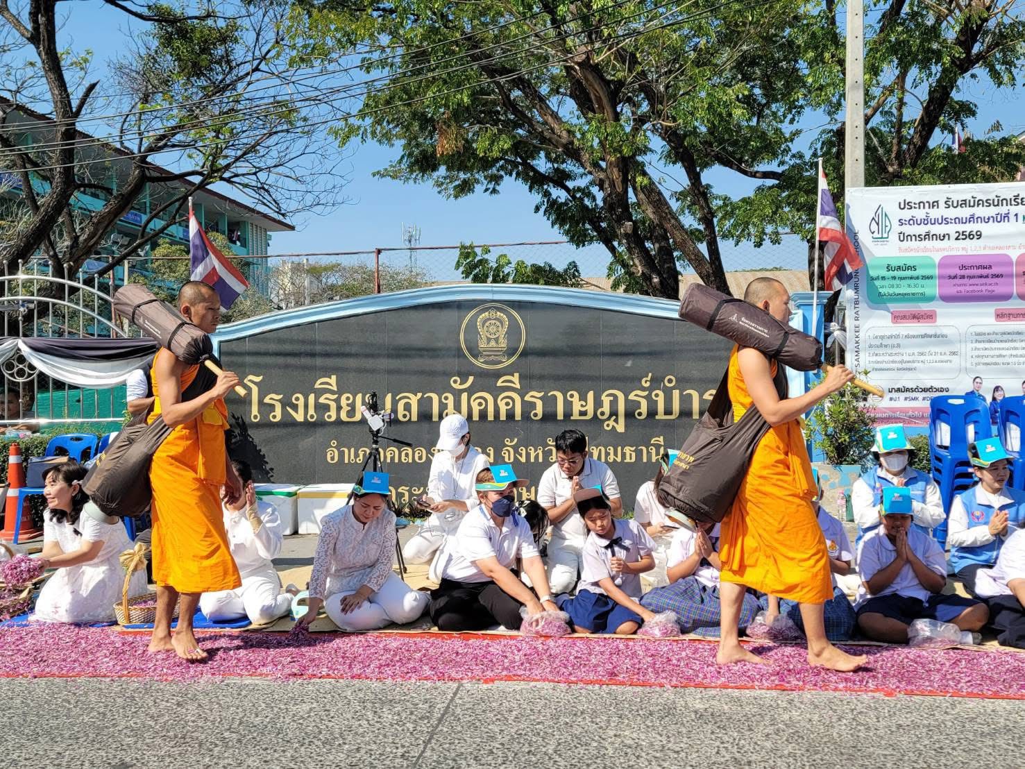 จากนั้นนักเรียนเด็กดี V-Star และคณะครู ร่วมกันโปรยดอกไม้แสดงความเคารพ ต้อนรับคณะพระธรรมยาตรา จากหน้าโรงเรียนสามัคคีราษฎร์บํารุง ถึงวัดพระธรรมกาย บรรยากาศเต็มไปด้วยความสงบ งดงาม อิ่มเอมใจ และปลื้มใจ