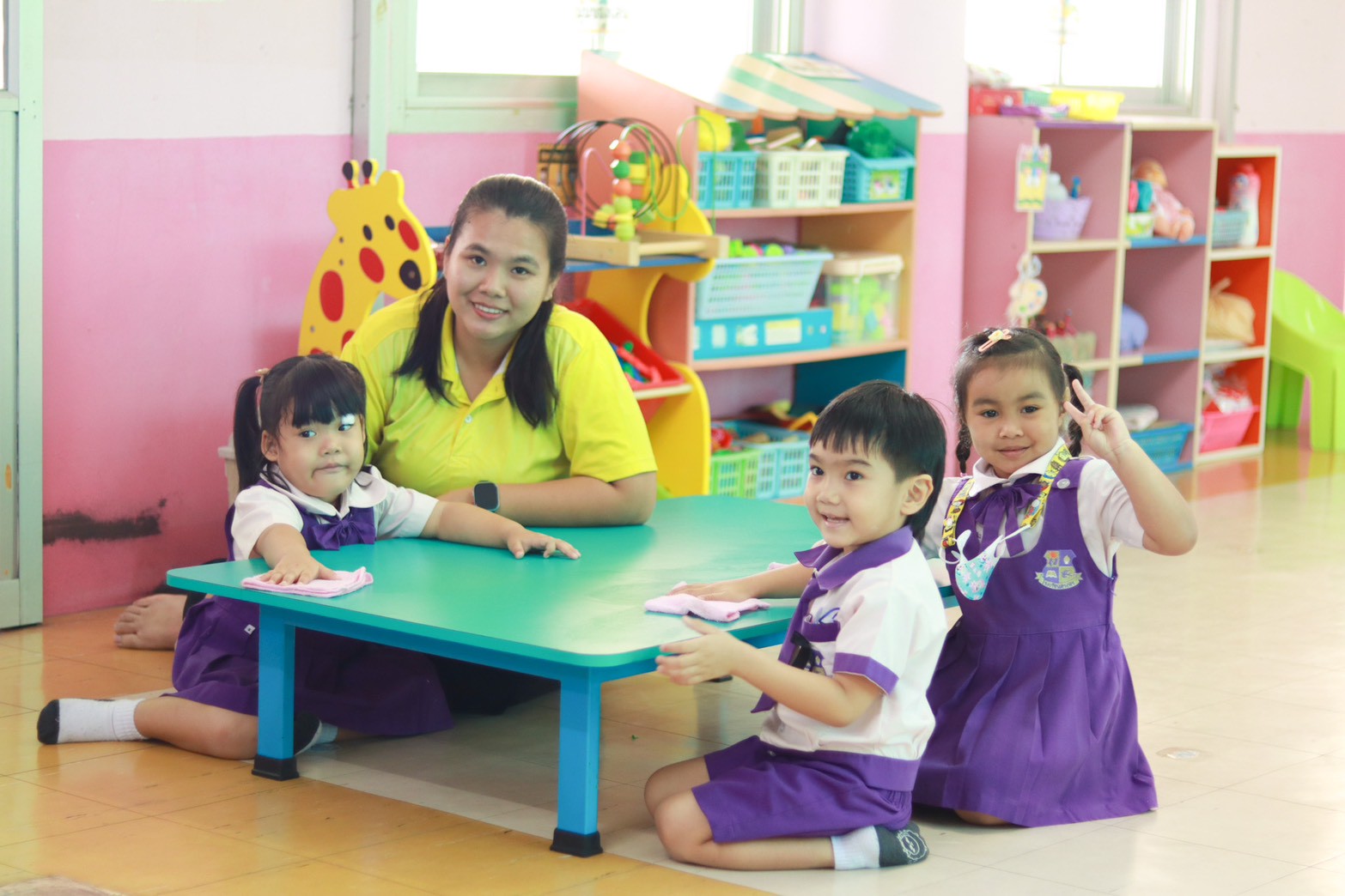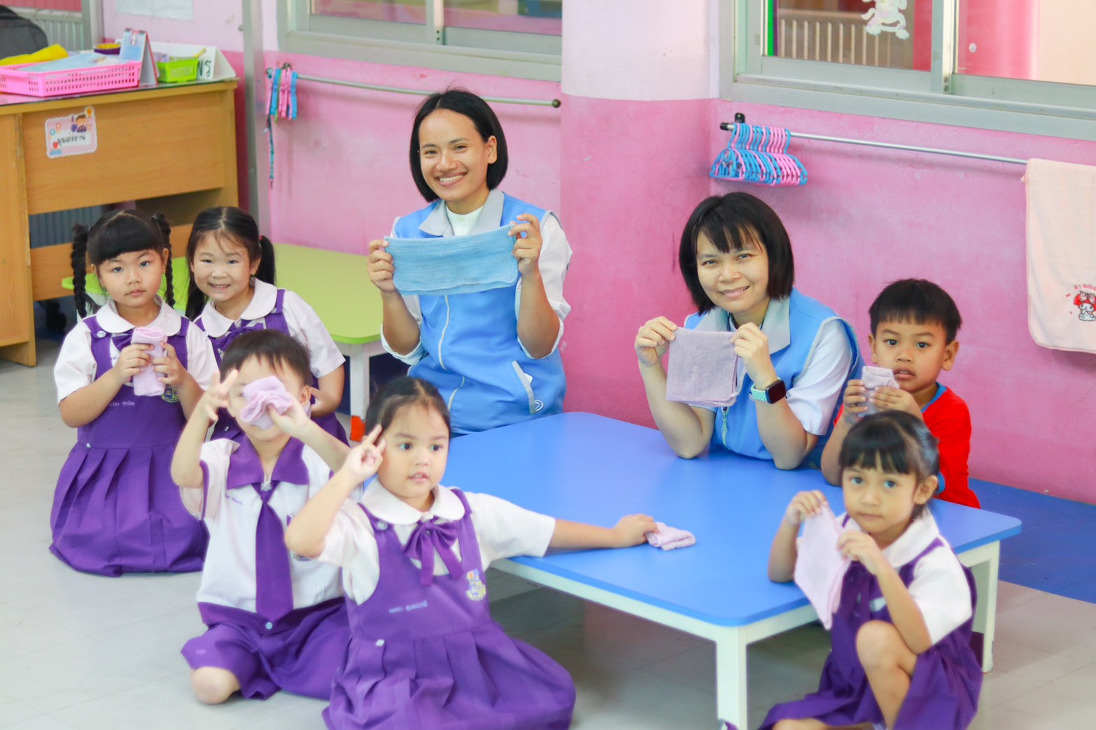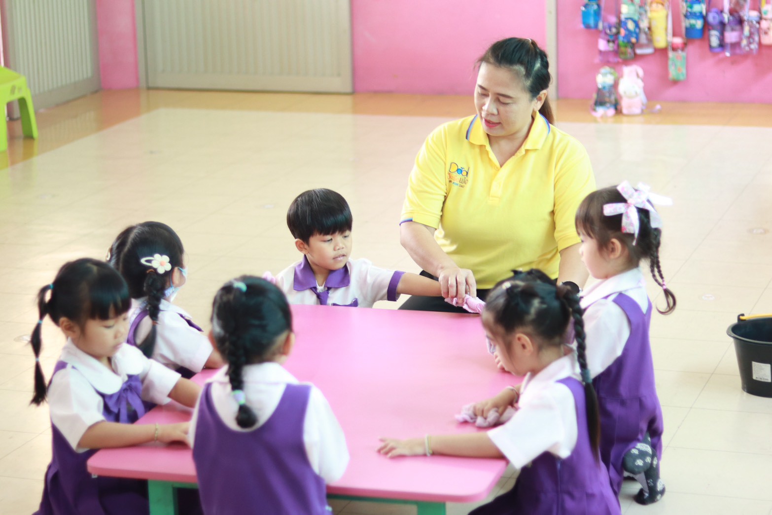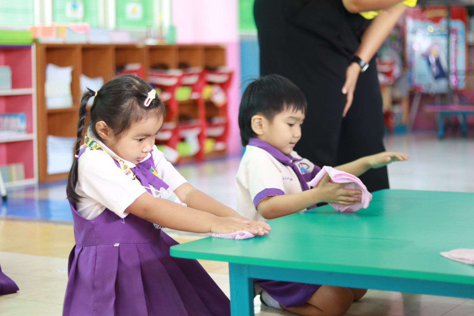 และฐานที่ 3 “อัศวินพิชิตความสะอาด” ฝึกทำความสะอาดห้องเรียน โต๊ะ, การใช้ห้องน้ำ และพื้นที่ส่วนรวม พร้อมเรียนรู้เรื่องความเคารพและการแบ่งปัน