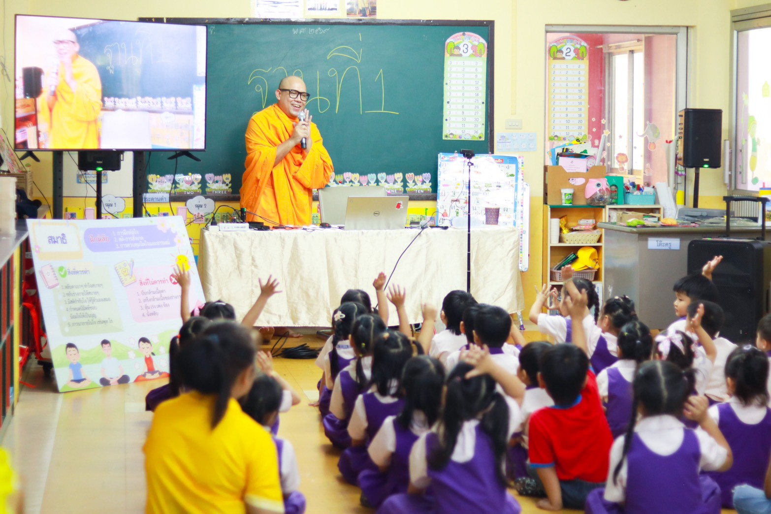 บรรยากาศภายเต็มไปด้วยความน่ารัก สดใสและความเอ็นดู ซึ่งระหว่างกิจกรรมพี่ ๆ ทีมงานจากชมรมพุทธศาสตร์สากลได้สันทนาการที่ช่วยสร้างความคึกคัก สนุกสนาน เด็ก ๆ ให้ความร่วมมืออย่างดี กล้าแสดงออก และมีความกระตือรือร้นตลอดกิจกรรม