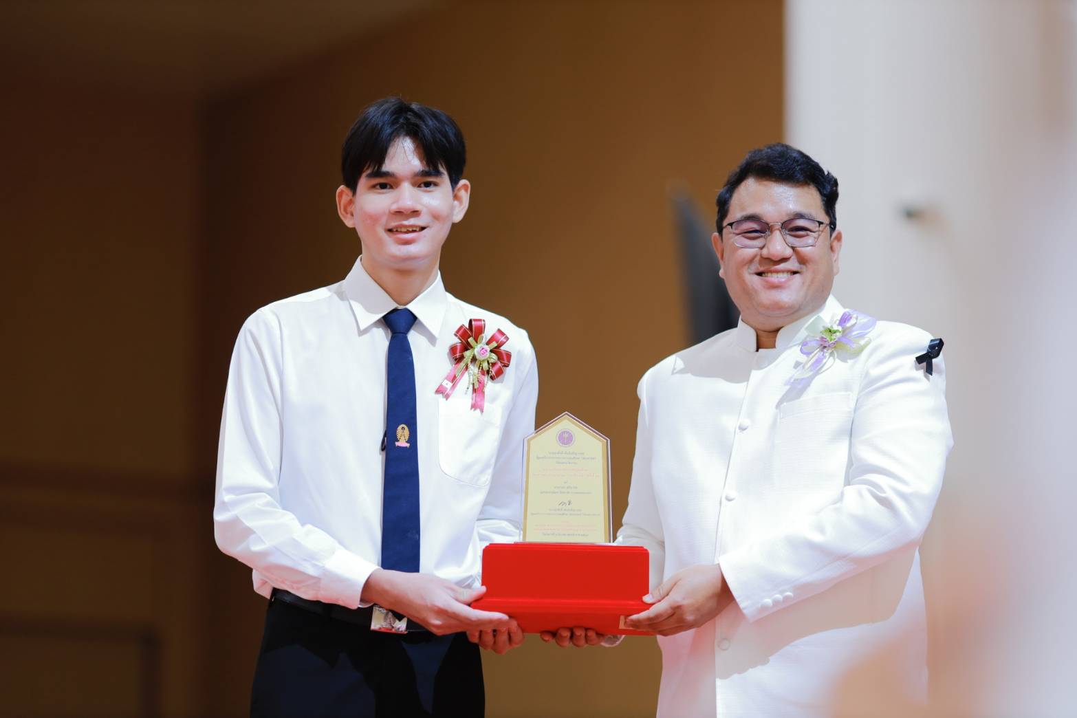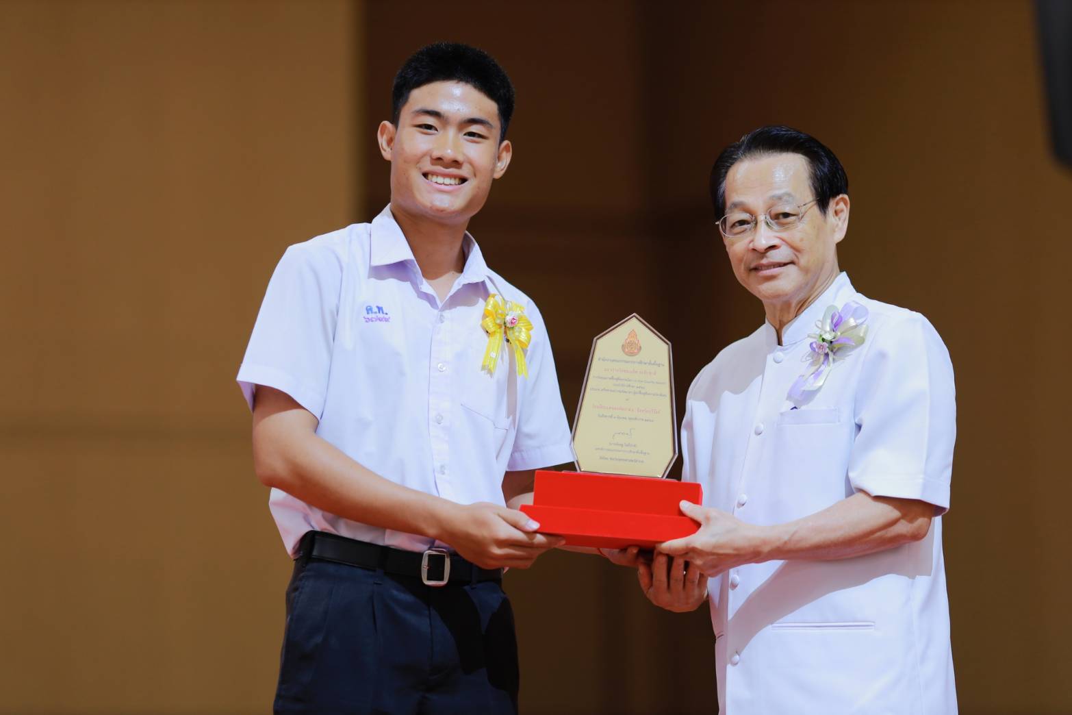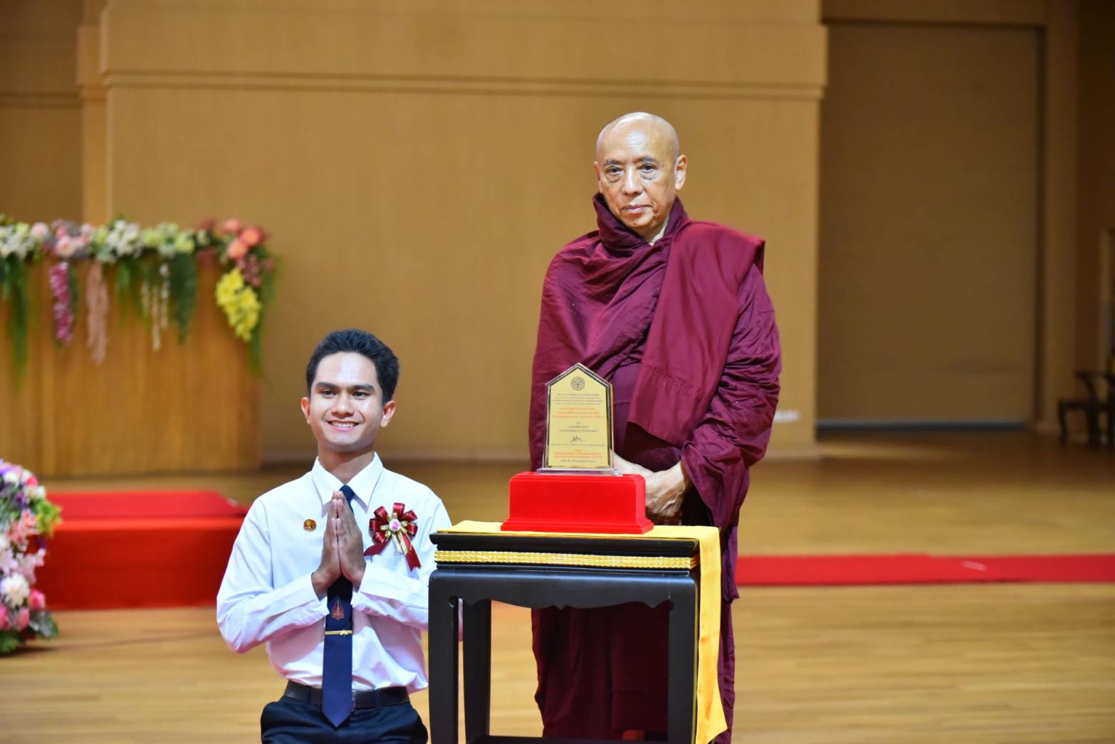 -นายธีภพ อนุไพร ผู้แทนรางวัลคุณภาพฟื้นฟูศีลธรรมโลก (VQA) ประเภทเครือข่ายเยาวชนจิตอาสาผู้นำฟื้นฟูศีลธรรมโลกดีเด่น โรงเรียนแคนดงพิทยาคม จังหวัดบุรีรัมย์