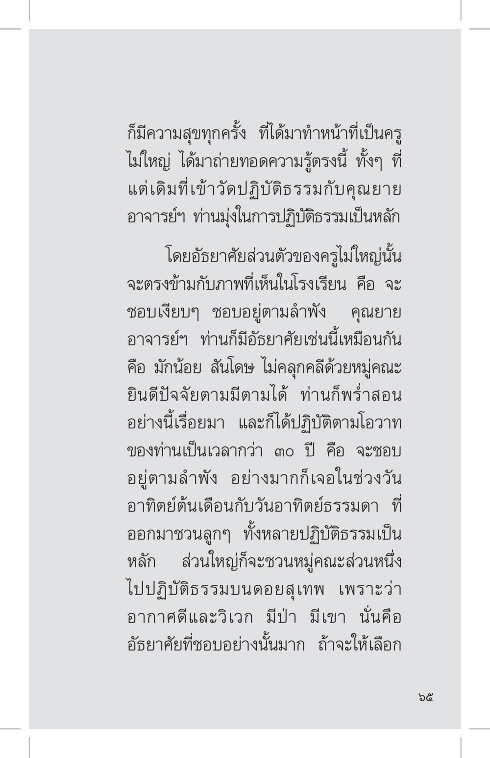 เนื้อหาเกี่ยวกับความสุขในการทำหน้าที่เป็นครูไม่ใหญ่ พร้อมกับการถ่ายทอดความรู้จากการปฏิบัติธรรมและการใช้ชีวิตแบบมักน้อย สันโดษ โดยมุ่งเน้นการชวนลูกศิษย์ไปปฏิบัติธรรมที่ดอยสุเทพ ซึ่งเป็นสถานที่ที่เหมาะสำหรับการทำสมาธิและเข้าถึงธรรม.