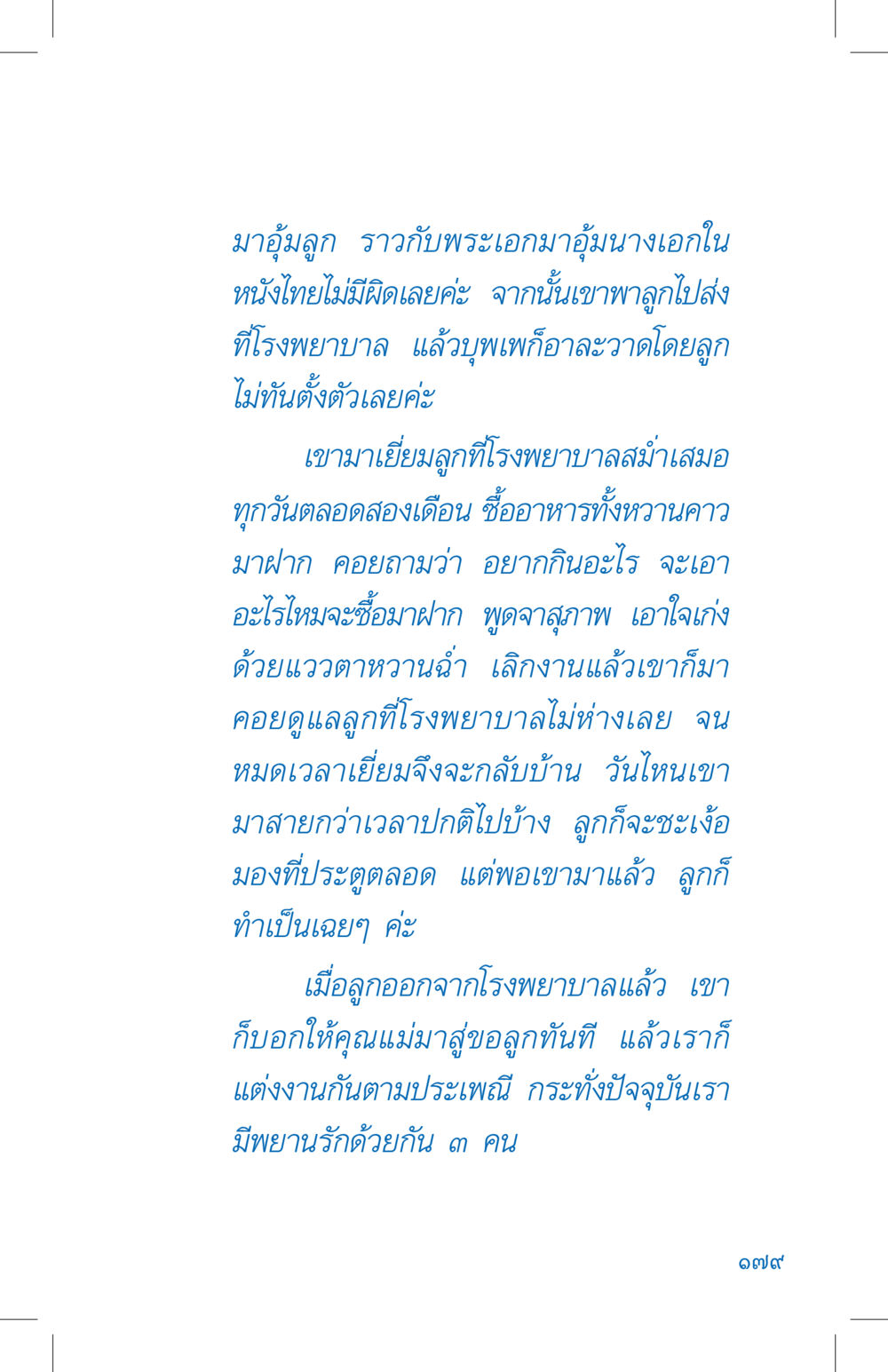 เรื่องราวของพ่อที่มาเยี่ยมลูกในโรงพยาบาลเป็นประจำ โดยซื้ออาหารและดูแลเอาใจใส่ จนกลายเป็นความรักและนำไปสู่การแต่งงานตามประเพณี มีพยานรัก 3 คนในปัจจุบัน เนื้อหาสะท้อนถึงความผูกพันที่เกิดจากการดูแลและเอาใจใส่ของพ่อที่ลูกได้รับในช่วงเวลาที่ยากลำบาก.