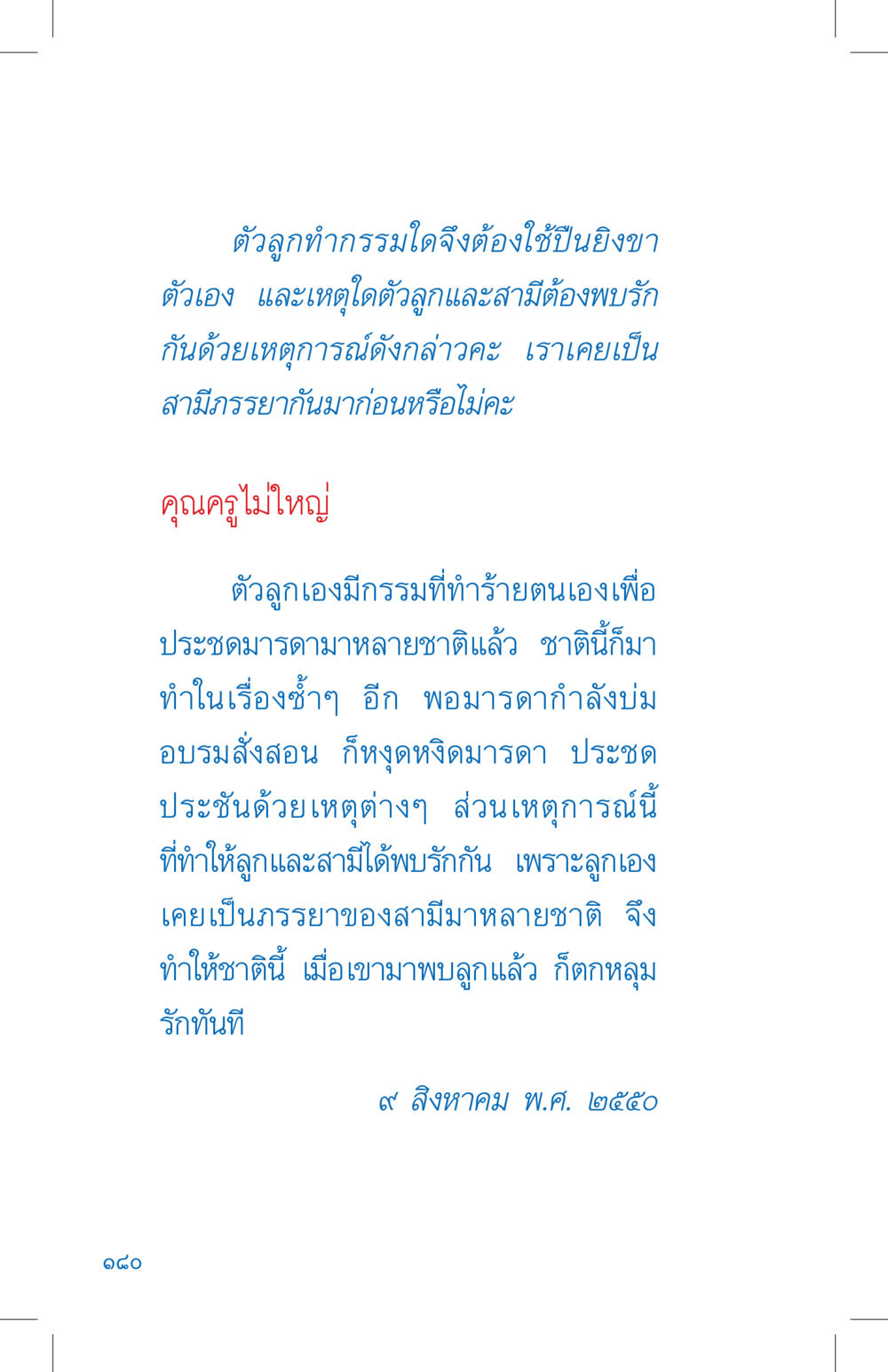 บทความนี้พูดถึงกรรมที่ลูกทำกับตัวเองและความรักที่เกิดขึ้นระหว่างลูกกับสามีซึ่งเป็นผลจากกรรมในอดีตที่ผูกพันกันมา โดยอธิบายว่าการทำร้ายตนเองและการพบรักในชาตินี้มีความเชื่อมโยงกับกรรมที่สร้างขึ้นในอดีต นอกจากนี้ยังมีการพูดถึงความสัมพันธ์ระหว่างลูกและมารดาที่มีการแสดงออกในลักษณะประชดประชัน การอบรมสั่งสอนที่มีผลต่อพัฒนาการและการดำเนินชีวิตในปัจจุบัน ทั้งนี้ การรักกันระหว่างลูกกับสามีอาจเป็นผลมาจากการที่เคยมีกรรมเกี่ยวข้องกันมาก่อนในหลายชาติ