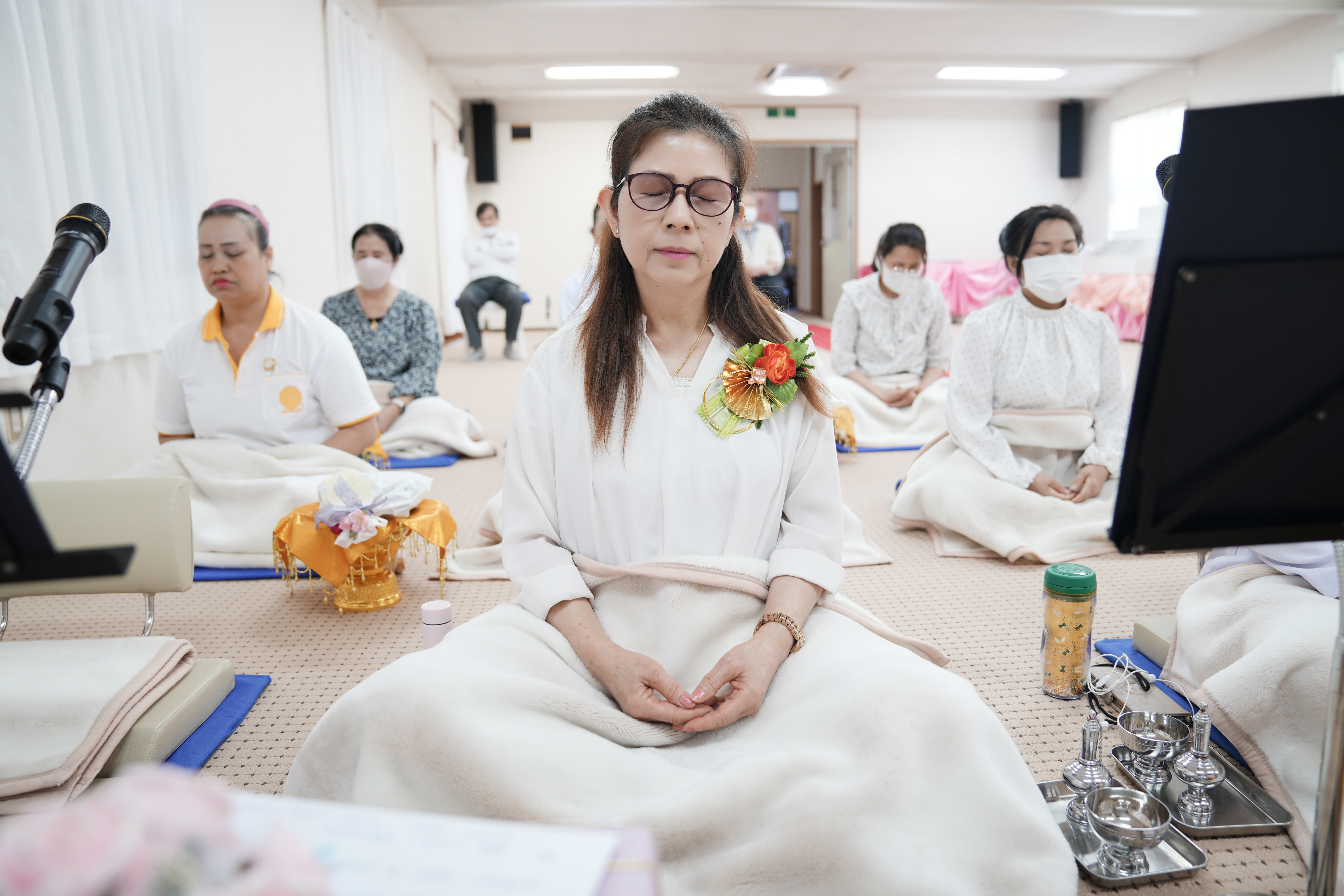 ก่อนที่จะได้ประกอบพิธีกล่าวคำถวายคิลานเภสัช โดยมีกัลยาณมิตรศรีไสว การะเกตุ, กัลยาณมิตรสุนิสา ทาเคชิเงะ และกัลยาณมิตรสุดสวาท ทะคะซึกะ เป็นประธานนำกล่าวคำถวาย พร้อมกันนี้คณะท่านเจ้าภาพก็ได้ร่วมถวายปัจจัย ไทยธรรมในกองบุญต่างๆ แด่คณะสงฆ์ ทั้งยังได้รับชมประมวลภาพการสร้างบารมีของผู้มีบุญที่เกิดในเดือนพฤษภาคม ก่อนที่ท่านประธานสงฆ์จะได้กล่าวสัมโมทนียกถาเรื่องอานิสงฆ์การให้ชีวิตสัตว์เป็นทาน จากนั้นได้เดินทางไปปล่อยปลา ณ แม่น้ำจิกุ ท่ามกลางธรรมชาติอันงดงาม ด้วยความปลื้มปีติในบุญกันทุกคน
